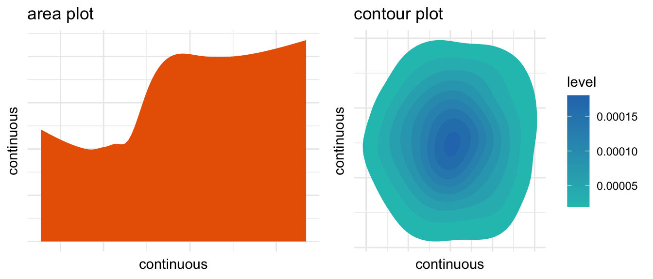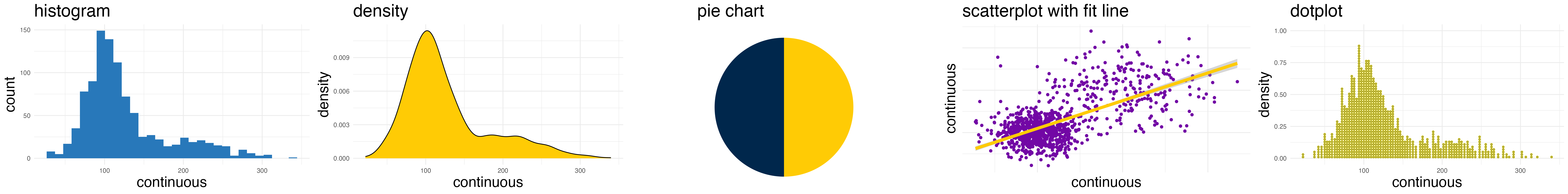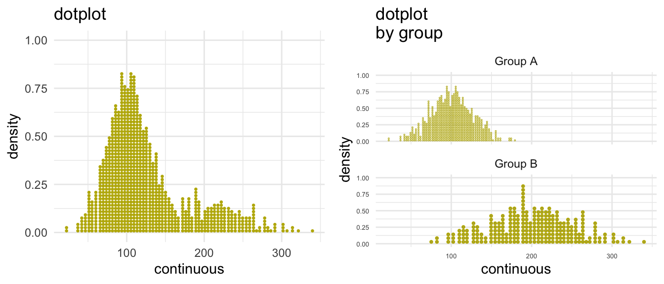 my_density <-ggplot(mydata, aes(x = y)) +geom_density(fill = michigan_maize) +ggtitle("density") +xlab("continuous") +ylab("density") +theme_minimal()my_facet_density <-ggplot(mydata, aes(x = y)) +geom_density(fill = michigan_maize) +facet_wrap(~w, nrow =2) +ggtitle("density by group") +xlab("continuous") +ylab("density") +theme_minimal() +theme(axis.text =element_text(size =5)) # small font size for axisplot_grid(my_density, my_facet_density, ncol =2)