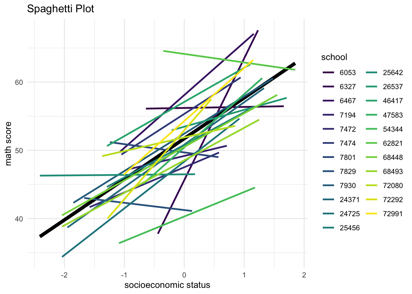 geom_smooth(aes(color = factor(schid)), # school specific linear smoother
