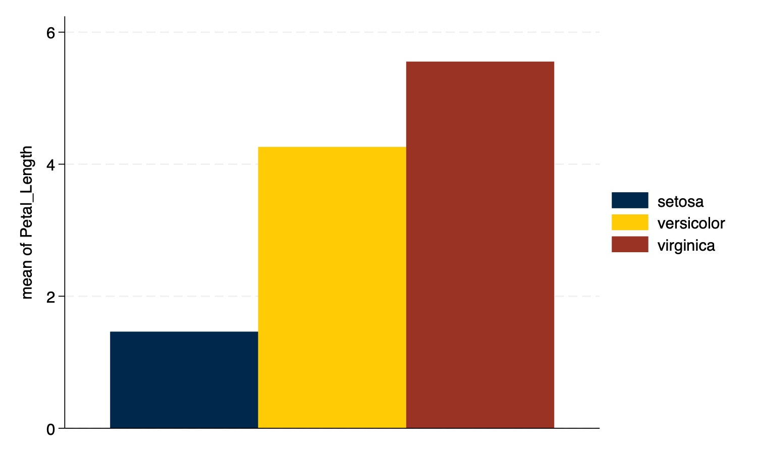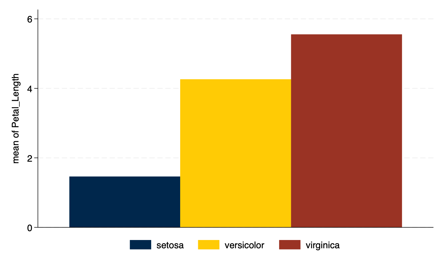 graph bar Petal_Length, over(Species) intensity(70) scheme(michigan) asyvarsScatterplot
