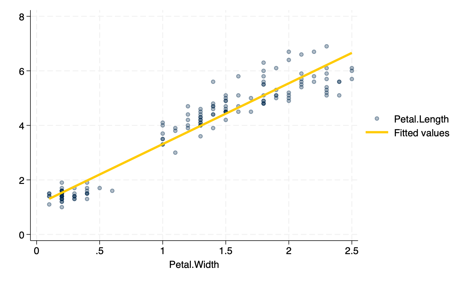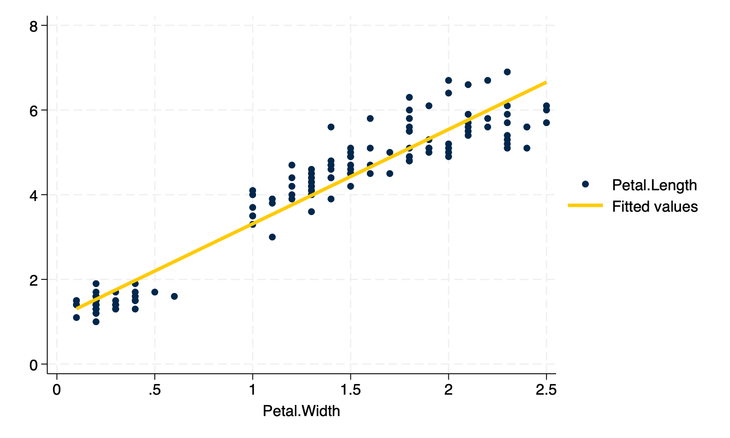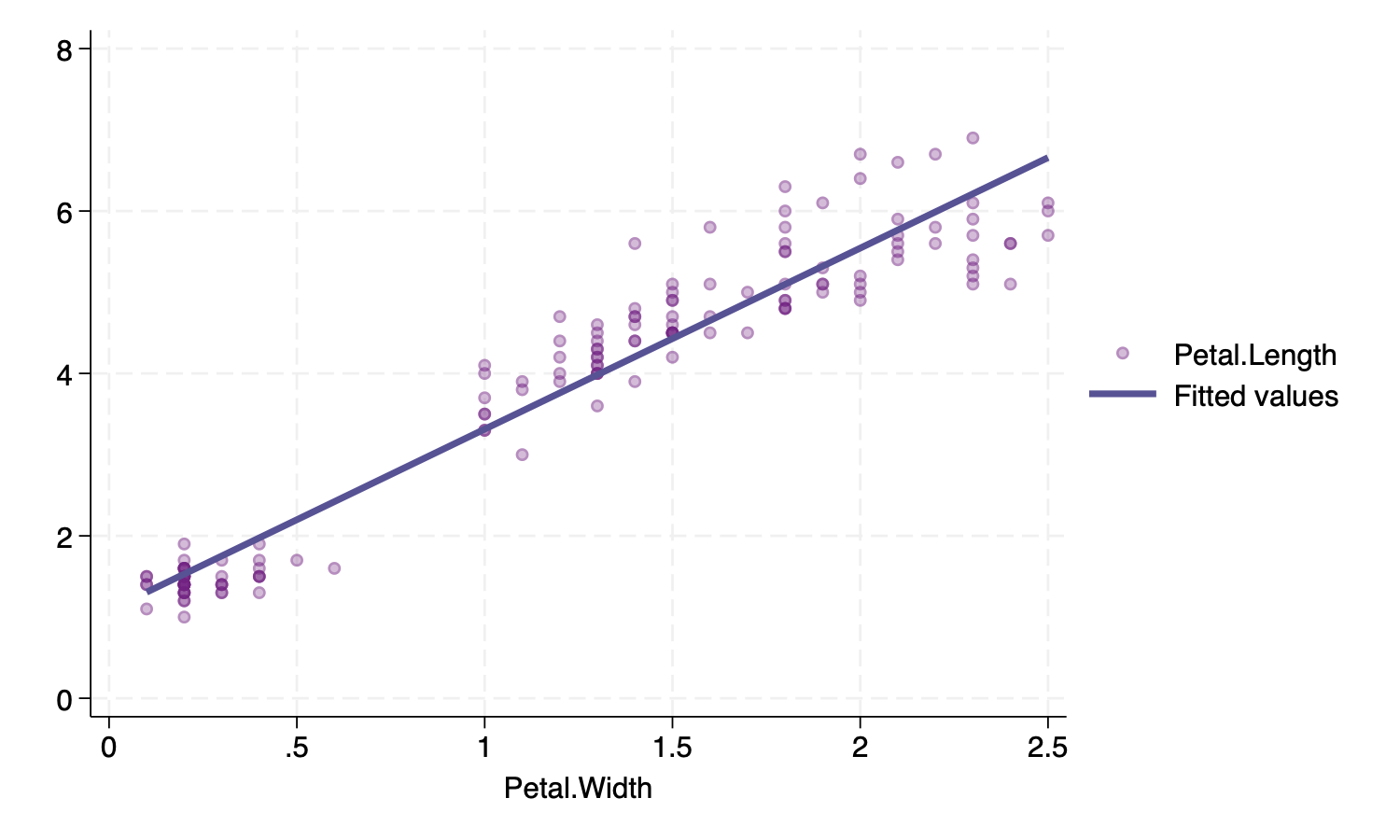 (lfit Petal_Length Petal_Width, lcolor("87 82 148")), /// Violet line
