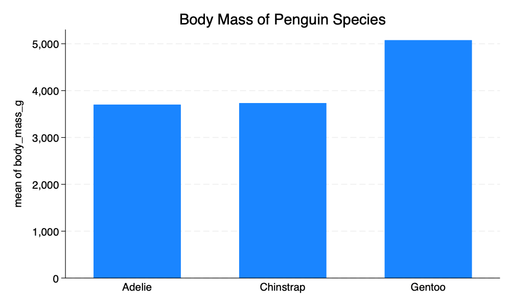graph bar, over(species) title("Penguin Species")Average Of A Continuous Variable Across Groups: graph bar y, over(x)