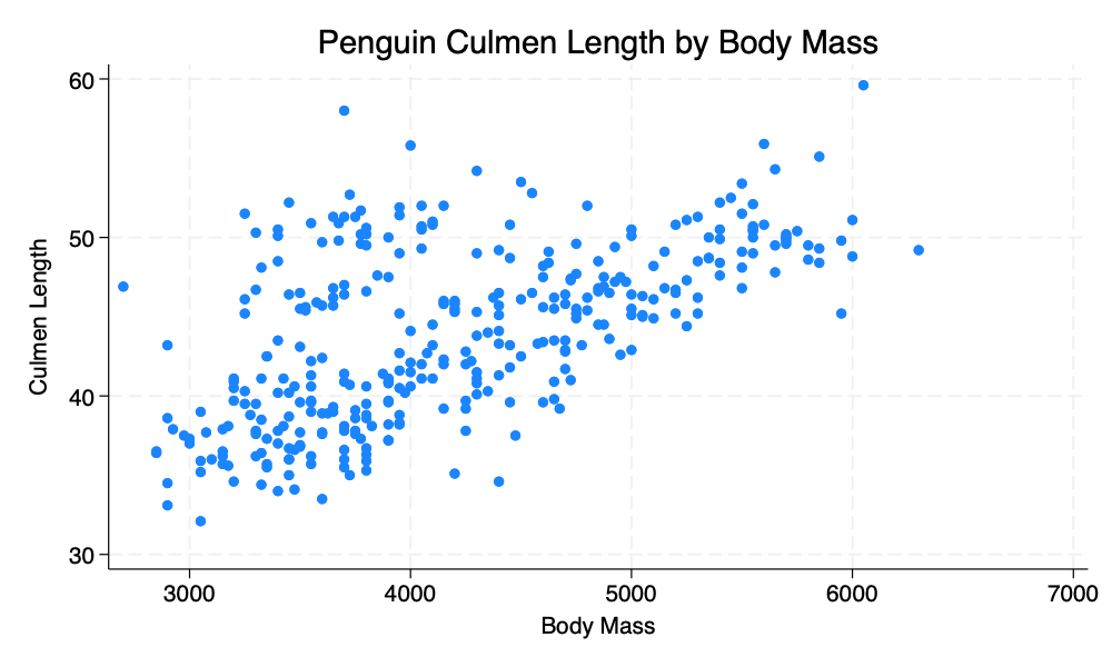 graph bar body_mass_g, over(species) title("Body Mass of Penguin Species")Scatterplot: twoway scatter y x