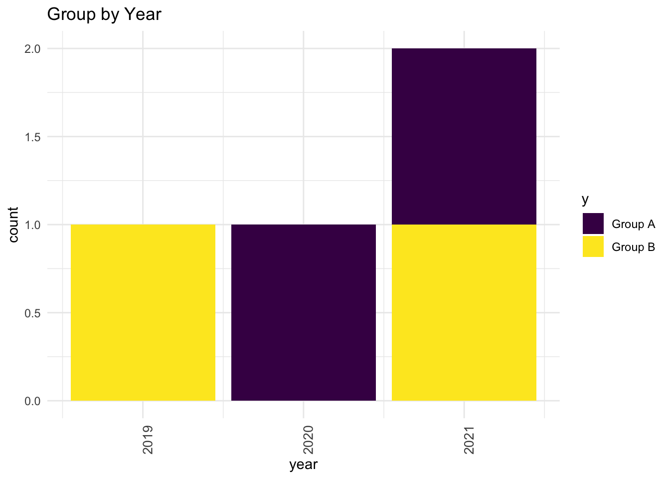 library(ggplot2)mydata %>%# my datamutate(myscale = x + z) %>%# dplyr command to make new variable filter(y !="Group C") %>%# filter on values of yggplot(aes(x = year, # the rest is ggplotfill = y)) +geom_bar() +scale_fill_viridis_d() +# viridis colorstheme_minimal() +# minimal themelabs(title ="Group by Year") +# labelstheme(axis.text.x =element_text(size =10, # tweak themeangle =90))