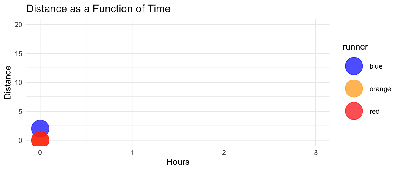 The blue runner’s situation is somewhat different. The blue runner runs at the same speed as the orange runner. We can say that their lines on the graph have the same slope.