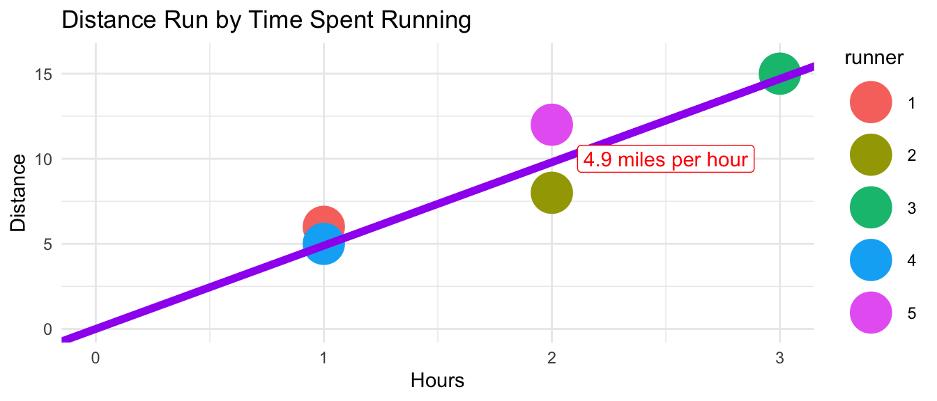 My best guess about the slope and intercept together are drawn as a purple line. It looks like for every hour run, on average, runners run just under 5 miles, so let’s say 4.9 miles per hour.