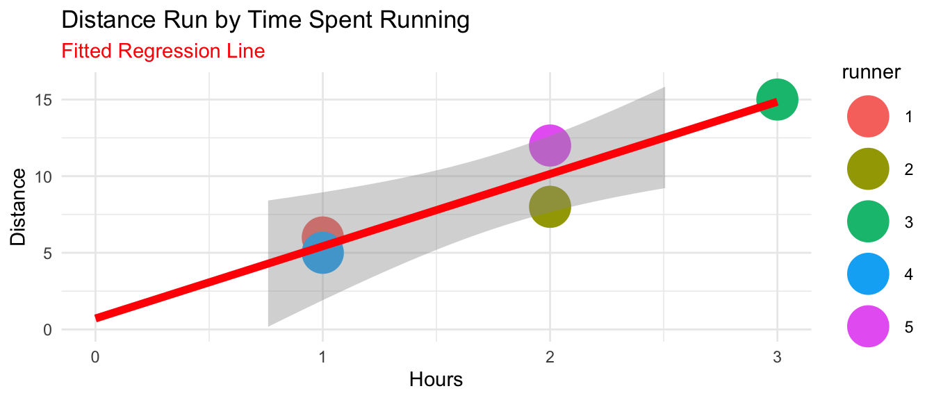The \(e_i\) is a new concept for us in this tutorial, and represents the error. To a certain degree we are going to make a wrong prediction about every runner in our data. We are trying to understand the distances that runners run, on average.